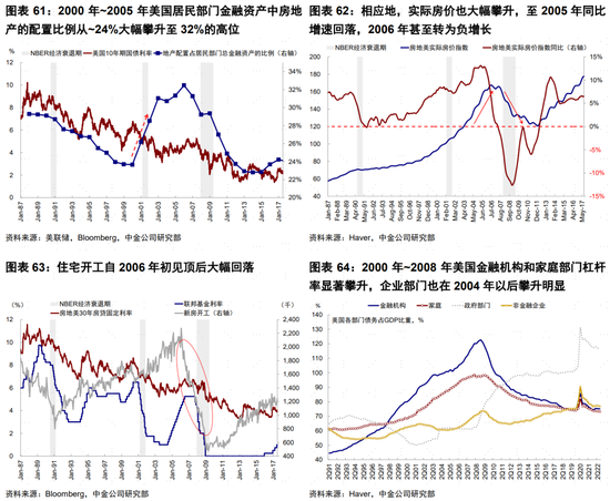 2)寬松的貨幣政策進一步推升地產泡沫。互聯網泡沫破裂后,美聯儲從2001年初開始降息,此輪降息周期直到2003年中才結束,聯邦基金利率從6.5%回落至1%,並在隨后的1年中維持低位。寬松的貨幣政策使得地產投資熱情更加高漲,從2000年至2005年末,美國居民部門金融資產中房地產的配置比例從~24%大幅攀升至32%的高位。