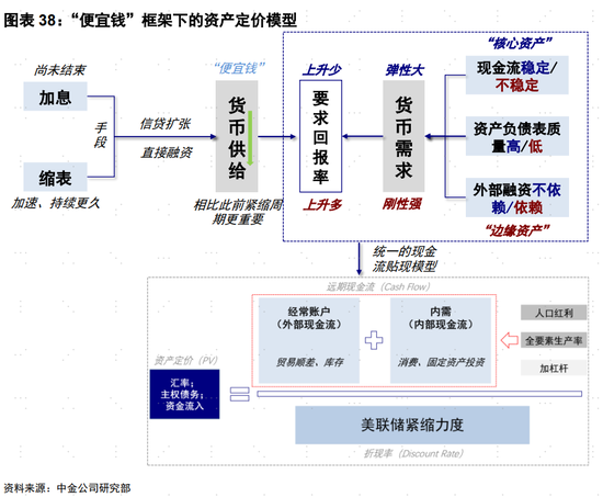 ►核心資產:與受損資產對應的,那些槓桿率低、現金流質量好、對外部融資依賴度低的資產貨幣需求彈性更強,則是相對受追捧的「核心資產」,例如優質成長股、內需有韌性或政策有刺激空間的市場和匯率,例如美元、外匯儲備充足且能賺取外匯的國家匯率、或者無論是資本市場還是經濟都不太依賴美元輸入,內需較強的國家匯率,甚至核心區域房產等。