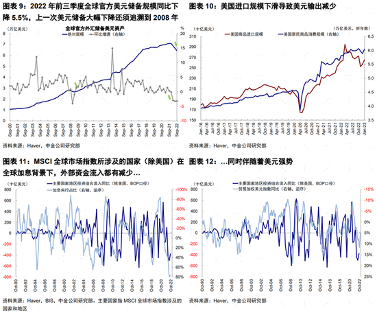 ►全球美元需求上升:以原油為代表的美元結算大宗商品價格上漲,導致能源等進口國家對美元需求上升。2022年前三季度,全球官方美元儲備規模同比下降5.5%,上一次美元儲備大幅下降還須追溯到2008年。