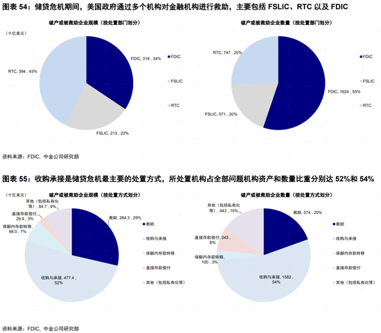 儲貸危機期間,美國政府通過多個機構對金融機構進行救助,主要包括FSLIC(Federal Savings and Loan Insurance Corporation)、RTC(Resolution Trust Corporation)以及FDIC(Federal Deposit Insurance Corporation)。其中FSLIC在1980~1989年共處置了約570家問題機構(總資產2,130億美元,佔所有問題機構的23%)、RTC在1989~1995年共處置了約750家問題機構(總資產3,940億美元,佔所有問題機構的43%)、FDI在儲貸危機期間總計處置了約1,600家問題機構(總資產3,180億美元,佔所有問題機構的34%)。