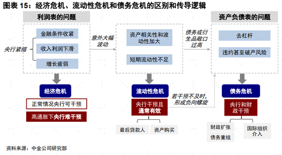 在緊縮周期和「便宜錢」減少的壓力下,通常經濟增速會放緩,甚至出現利潤表式的衰退;在這個背景下如果疊加出現一些意外的大幅波動(例如此前英國國債利率大幅走高導致的養老金爆倉風險),則會由於資產相關性和波動性加大造成短期流動性不足問題,繼而演化為流動性風險;央行對流動性風險干預不及時,或者本身債務敞口高質量差,則可能進一步形成更為嚴重的資產負債表式的債務危機。