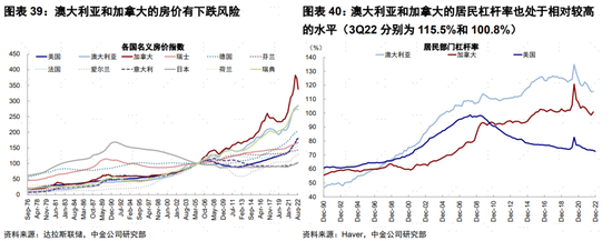 ►部分國家地產:如澳大利亞和加拿大。在融資成本大幅下降后,這兩個國家地產價格都有明顯的上漲。但與前期因次貸危機去槓桿,當前仍有較為健康的居民部門資產負債表的美國不同,澳大利亞和加拿大的居民槓桿率也處於相對較高的水平(3Q22分別為115.5%和100.8%,美國為72.5%)。受到加息周期帶來的金融條件緊縮,居民購房能力回落的影響,這些國家的地產價格存在一定下行壓力,以加拿大為例,其名義房價已經在兩個季度內下跌11.6%。房價的下跌會造成抵押品價值下降、居民主動違約意願上升,甚至引發主動斷供,這些斷供會降低銀行等金融機構及MBS資產池的資產質量,提升壞賬率。如果跌幅過大且時間過快,甚至可能帶來更為嚴重區域性金融風險(《進入下行通道的美國地產》)。