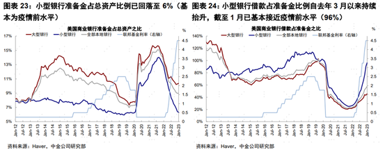 槓桿方面,金融危機后,美國金融部門在強監管下整體槓桿處於較低水平,且資本充足率也相對健康,因此發生大面積的債務危機的可能性似乎並不高。2008年金融危機后,美國金融部門實現了較好的去槓桿。截至3Q22,金融部門槓桿水平從2008年金融危機期間的123%回落至3Q22的75%,資產負債表質量相對健康(《從槓桿角度看緊縮成本和衰退壓力》)。進一步從不同規模銀行的資產負債表來看,小型商業銀行的流動性充裕度收緊更為明顯,但美國大型銀行及本地商業銀行整體仍相對健康。在美聯儲持續加息縮表的背景下,銀行準備金回落明顯,迫使銀行借款需求增加。小型銀行準備金佔總資產比例已回落至6%(基本為疫情前水平);借款佔準備金比例自去年3月以來持續抬升,截至1月已基本接近疫情前水平(96%)。相比而言,大型銀行相對更為健康。
