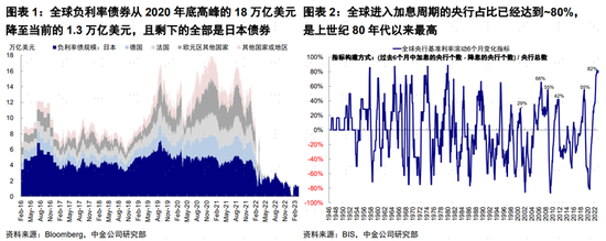 2022年以來全球的一個大環境是以美聯儲為代表的全球主要央行激進緊縮,所導致的融資成本持續抬升和「便宜錢」減少甚至消失。一個直接證據是全球負利率債券從2020年底高峰的18萬億美元降至當前的1.3萬億美元,且剩下的全部是日本債券。與此同時,全球進入加息周期的央行佔比已經達到~80%,是上世紀80年代以來最高;作為負利率和「便宜錢」最后陣地的日本央行YCC政策也大概率可能取消(《如果日央行意外放棄YCC?》)。