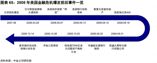 2004年6月,在通脹有所攀升的背景下,美聯儲在按兵不動1年之后首次加息,並開啟了長達2年的加息周期。此輪加息周期共加息17次,聯邦基金利率從1%的低位攀升至5.25%。2005年,美國實際房價同比增速見頂,隨后開始回落,至2006年底甚至轉為同比負增長;住宅開工也在2005年見頂,隨后大幅回落。在此背景下,次級貸款抵押證券面臨償付壓力,而金融業的混業經營又使得風險從抵押貸款機構和投資銀行蔓延至保險機構、儲蓄機構和商業銀行等,最終釀成危機。居民和金融機構開始大幅去槓桿,從而也使得情況進一步惡化。危機爆發過程中的典型事件包括2008年3月摩根大通收購貝爾斯登、2008年9月15日雷曼宣佈破產。