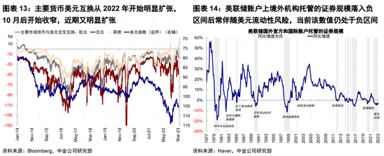 相對2022年的極端情況,當前各類衡量美元離岸流動性指標都已經有所緩解,但風險仍未完全消除。俄烏局勢助推了風險偏好下降和全球美元流動性收緊,主要貨幣美元互換從2022年開始明顯擴張,10月后開始收窄,近期又明顯擴張。后續英美縮表和衰退壓力下的信貸收縮影響仍未完全消除,日央行緊縮也存在不確定性,此外部分高槓杆、高估值資產和邊緣國家壓力尚未化解。從指標看,美聯儲賬户上境外機構託管的證券規模落入負區間后常伴隨美元流動性風險的發生,當前該數值仍處於負區間,因此難言風險完全消除。