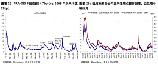 流動性角度,我們追蹤的一系列美國在岸及離岸流動性的收緊也並沒有那麼顯著。例如,在岸美元流動性方面,FRA-OIS利差當前4.7bp(vs. 2008年以來均值27bp);信用利差自去年三季度高點整體回落,但近期小幅抬升,當前高收益債和投資級信用利差分別為4.7ppt和1.8ppt(vs. 去年三季度高點6.1ppt和2.3ppt);90天AA級金融和非金融行業商票利差自去年11月的高點顯著回落;隔夜逆回購(ON RRP)仍維持2.2萬億美元的相對高位。離岸美元流動性方面,全球主要市場貨幣如歐元、日元、及英鎊與美元3個月交叉互換今年開始有所走闊。不過,流動性的情況畢竟也受到市場情緒和交易因素影響,后續一些事件(3月14日美國CPI,3月23日美聯儲FOMC會議)都值得關注是否會成為催化劑。重點可以觀察上述流動性指標。
