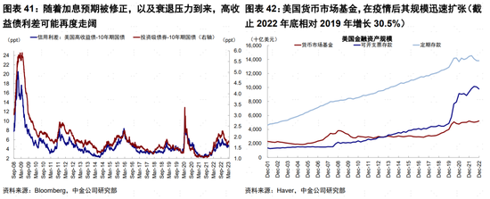 此外除了當前受到市場關注的美國銀行系統風險外,那些監管強度更低的影子銀行可能面對的風險也需要格外關注。如美國貨幣市場基金,疫情后其規模迅速擴張(截止2022年底相對2019年增長30.5%),從市場參與度層面,其投資標的緊密聯繫企業短期流動性,負債端又類似銀行,起到了類存款的作用,影響同樣較大。貨幣基金底層資產通常是商業票據和其他短期債券。而這些商業票據是非金融企業用以支付員工薪酬、醫保和供應商的主要短期融資工具。通常情況下因為這些資產期限短,風險比較低。但如果發生短期流動性衝擊導致商業票據利差快速攀升,企業融資甚至商票被拋售的壓力可能增大,一旦商票市場失靈可能導致即便是優質企業也會發生技術性違約和破產,從而衝擊實體經濟。