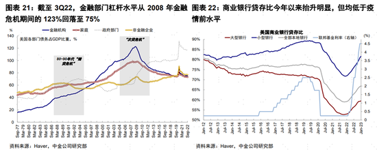 從當前情況看,美國金融體系在加息背景下存在一定「脆弱性」,但發生大面積債務危機的風險可能有限。全球緊縮拐點或在2023年中,縮表可能持續更長,同時信貸收縮等的滯后反應也意味着「便宜錢」消失尚未結束,因此部分薄弱環節仍會面對壓力。從美國自身情況看,當前美國金融部門整體槓桿不高(2008年金融危機的123%降至3Q22的75%),大銀行相比小銀行更健康。從指標看,我們追蹤的一系列美國在岸和離岸流動性指標並未大幅收緊。極端情形下,美聯儲也仍有充裕手段和經驗應對。只不過,潛在的鏈式傳導本身就具有隱蔽性和突發性,短期部分金融機構脆弱性和局部傳染風險都會加大市場擔憂情緒和波動。如果沒有出現進一步傳導,那可以初步判斷影響範圍是可控的。