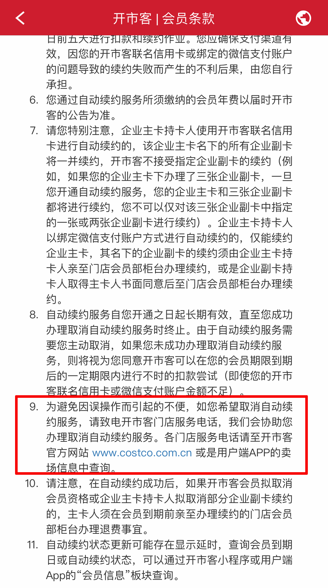 開市客App中有退訂渠道嗎?《會員條款》中是這樣註明的:取消自動續費需要致電門店服務電話,理由是「為避免因誤操作而引起不便」。門店電話是什麼,條款中未有註明,需要消費者自己去搜索查詢。