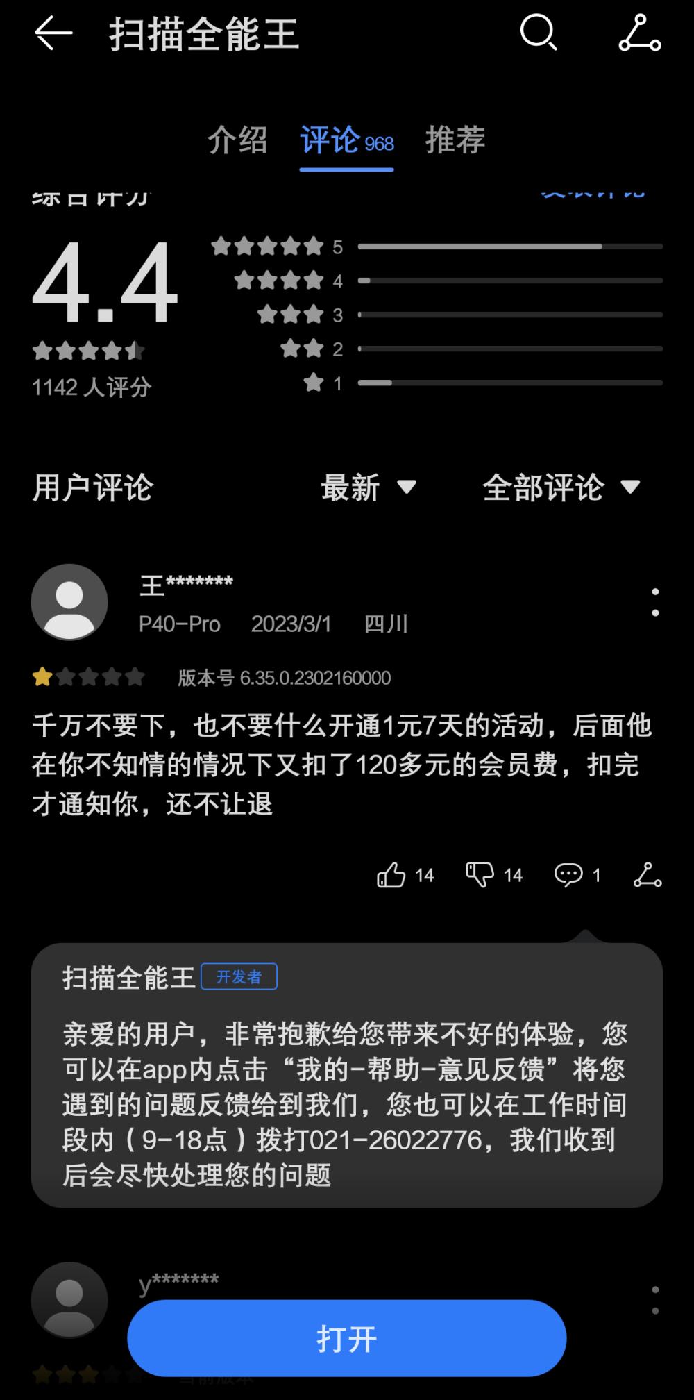 如市民李女士反映稱,去年2月,她因傳輸文件的工作需要下載了一款名為「掃描全能王」的App。由於需要去除水印的專業功能,且軟件提供「1元試用7天」的優惠活動,她便付費1元開通了7天的試用會員。且由於平時較少用到這款App,試用完畢后她則將軟件卸載。近日,她偶然在「小紅書」上刷到一則「警惕別踩坑」的帖子,分享了試用掃描全能王后被扣會員費的經歷,便翻閲了自己的支付寶賬單,這才發現今年2月23日和去年的2月23日,分別有258元和99元的掃描全能王高級賬户年費扣費記錄。她又查閲了自己的短信通知,發現在扣款前5日及扣款完成后,掃描全能王均給她發送了相關的提醒短信,但淹沒在日常的大量短信中未引起她的注意……