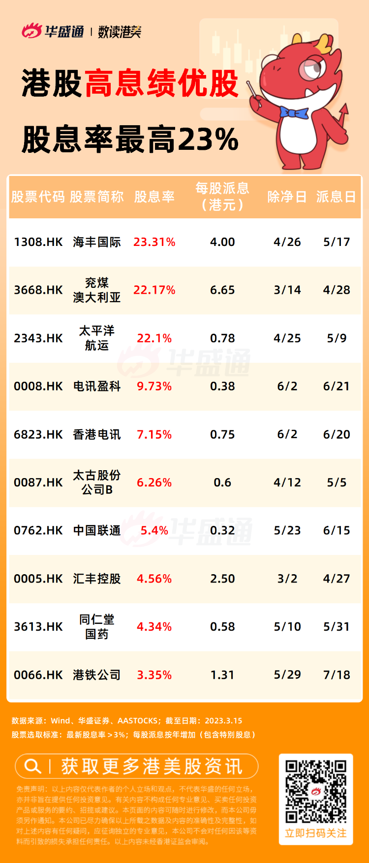 以下是華盛資訊為大家篩選出的10只盈利表現理想且派息有增無減,股息率在3%以上的股票,包括海豐國際、兗煤澳大利亞、太平洋航運、電訊盈科、香港電訊-SS、太古股份公司B、中國聯通、匯豐控股、同仁堂國藥、港鐵公司等,喜好高息股的投資者不妨留意參考。