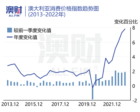 在澳大利亞的情況似乎與美國相同。根據下圖ABS的數據顯示,在澳大利亞,消費者價格指數環比上漲7.8%,漲幅為近10年來最高水平。