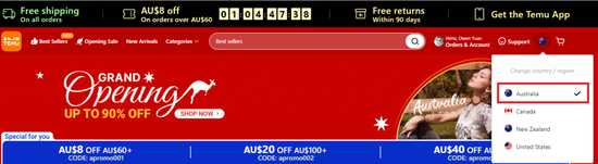 隨着拼多多旗下的跨境電商平臺Temu在北美爆紅后,終於如期登陸南半球。3月13日,有細心的消費者發現,在Temu官方網站的地址欄(見下圖右側),可選澳大利亞及新西蘭國家進行購物,這也意味着其正式在澳新地區上線。
