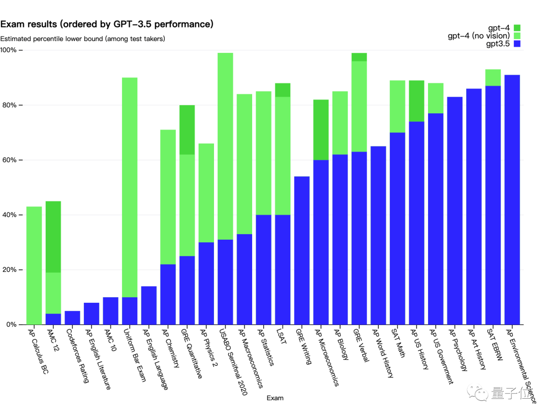 比如模擬律師考試,GPT-4取得了前10%的好成績,相比之下GPT-3.5是倒數10%。