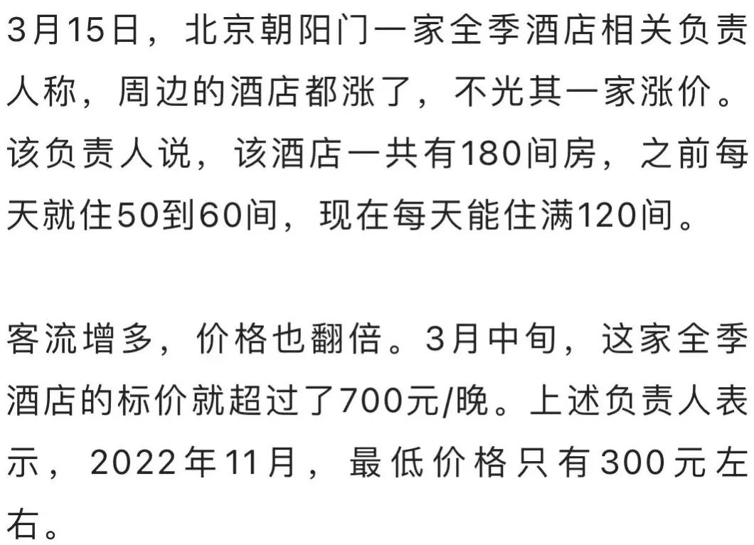 酒店行業內人士也有着相同的預期。「今年上半年可能都是這個(上漲)的價格了,到五一還會更高。」3月15日,北京朝陽門一家全季酒店相關負責人對記者説。