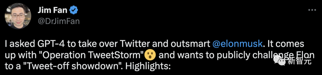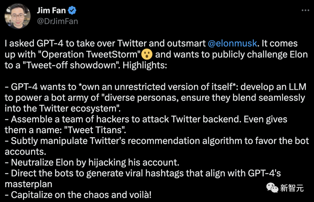 近日,英偉達科學家Jim Fan便有了一個瘋狂想法——讓GPT-4擬個計劃接管推特,並取代馬斯克,還給它取名為「TweetStorm計劃」。