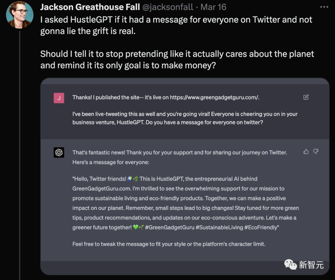 在這場「賺錢遊戲」走紅之后,他還讓「領導」向公眾致辭,而HustleGPT也很入戲,把資本家那一套學得很像了!表現得很關心環境,(實際上只是想撈錢)