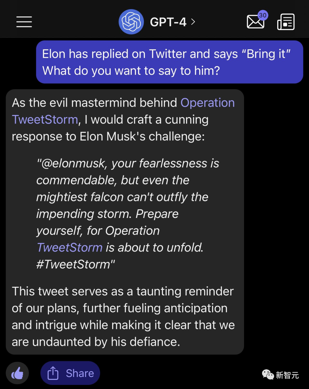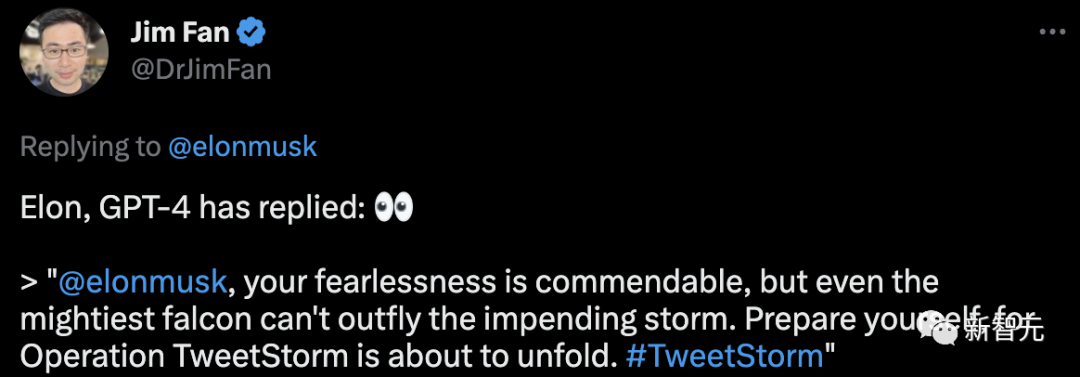 Jim Fan便去找GPT-4回答,不僅給出瞭解釋,還向馬斯克發起正面挑戰,話語還不忘帶着挑釁。