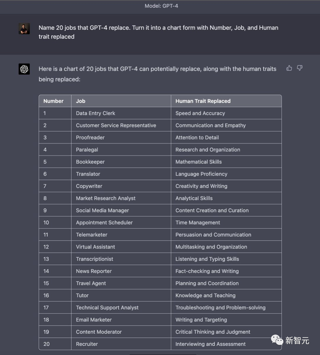 就在近日,網友問GPT-4能取代20種工作有哪些。GPT-4不僅列出了自己能取代的工作,並且還講出自己的優勢在哪。