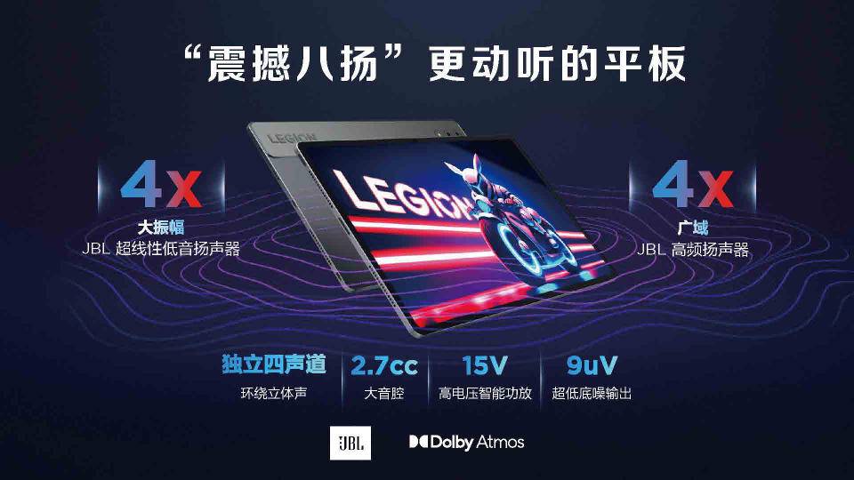 在聯想悦聲科技加持下,Y900通過八枚特殊調校的JBL揚聲器——4個超線性低音單元和4個超寬頻高音單元組合,使低音更渾厚,高音更透徹。同時適配了愛奇藝、優酷、嗶哩嗶哩等主流視頻平臺APP的最高畫質。Y900還支持杜比視界和杜比全景聲,讓畫面更精緻鮮活,聲音更真實沉浸,Y900致力於打造平板電腦影音體驗新標杆。