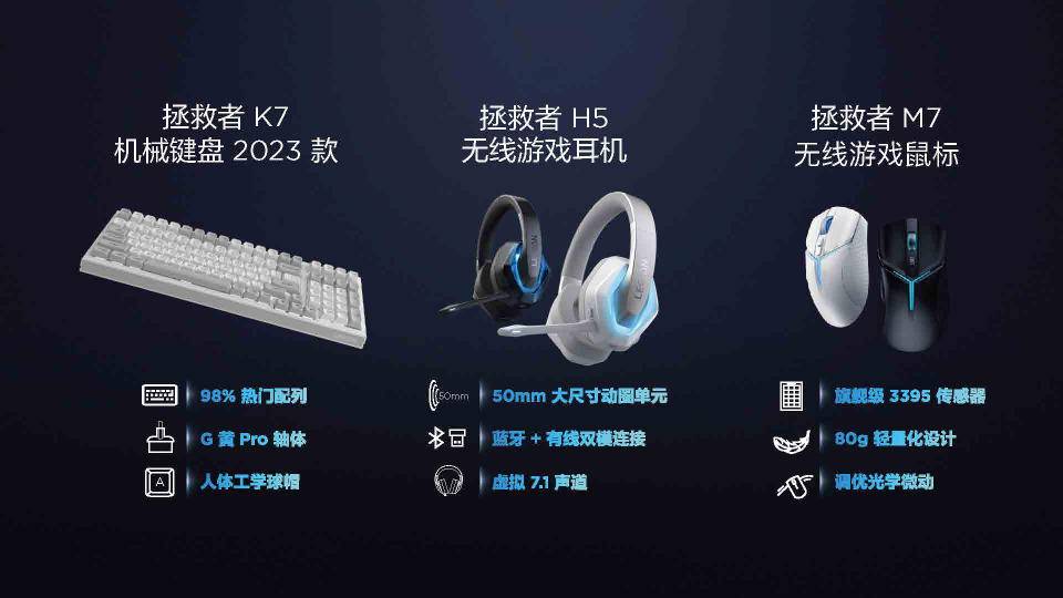 同時,拯救者還帶來了廣大玩家在遊戲過程中,最不可或缺的拯救者「鍵+鼠+耳」無線三件套,讓辦公和遊戲的體驗再度升級。首先是拯救者K7機械鍵盤,G黃 Pro軸體,貼合指腹的鍵帽,手感與舒適兼具;拯救者M7無線鼠標,小於80g的輕量化設計,使用起來不累手;拯救者H5無線遊戲耳機,50mm大尺寸動圈單元,虛擬7.1聲道,遊戲與音樂兼具。