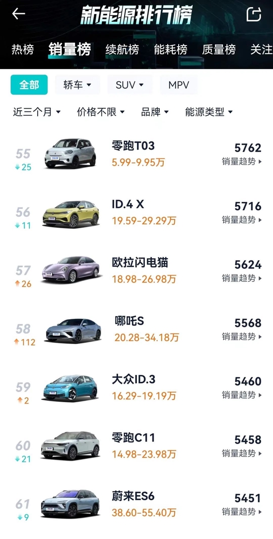 其中,C11在今年1月銷售量僅426輛,2月也只有1712輛,近三個月新能源銷售排名下滑21位,位列60名。10萬以內車型零跑T03則下滑25位,排第55名。在新款比亞迪秦PLUS起步款降至9.98萬后,低價區間的戰爭,必將是一場攸關生死的遊戲。