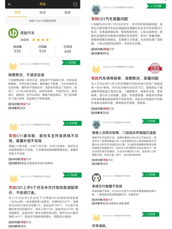 而在黑貓投訴【投訴入口】平臺,零跑汽車的投訴量也達939個(截至2023年3月23日),投訴多與銷售誤導下單后退定受阻有關,從對投訴內容來看,在成為「尊貴的零跑車主「,建議大家再多研究一下這個公司,一般退定環節受阻的話,我持保留意見。