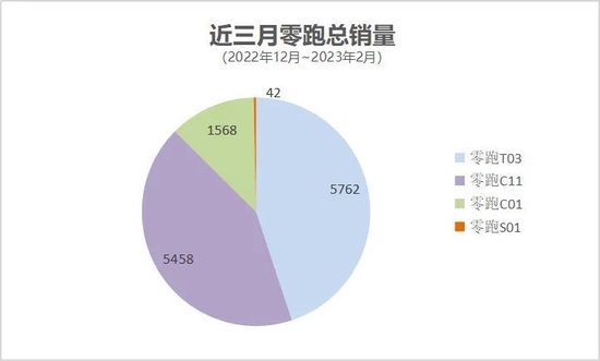 據汽車之家相關數據顯示,近三個月(2022年12月、2023年1月、2023年2月),零跑T03銷售量5762輛,零跑C11銷售量5458輛,零跑C01銷售量1568輛,零跑S01銷售量42輛。總銷售量12830輛,排名次於紅旗汽車,位列新能源車銷售榜第22位。