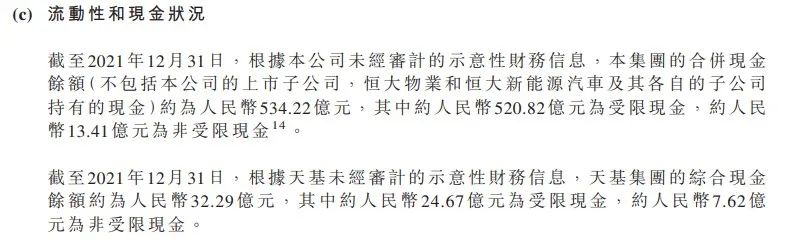 此次公告披露,截至2021年末,未經審計的示意性財務信息顯示,恆大的合併現金余額( 不包括本公司的上市子公司,恆大物業和恆大新能源汽車及其各自的子公司持有的現金)約為534.22億元,其中約人520.82億元為受限現金,約13.41億元為非受限現金。