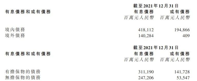 截至2021年末,根據恆大未經審計的示意性財務信息,恆大的有息債務在合併基礎上總額約為人民幣5584億元,或有債務約1953億元。