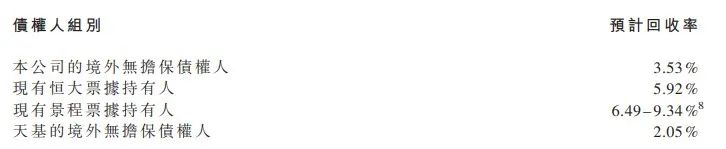 根據初步分析 ,在集團層面的清算中對本公司的境外無擔保債權人的預估回收,預計約為人民幣97.28億元,不同組別債權人的預估回收率如下: