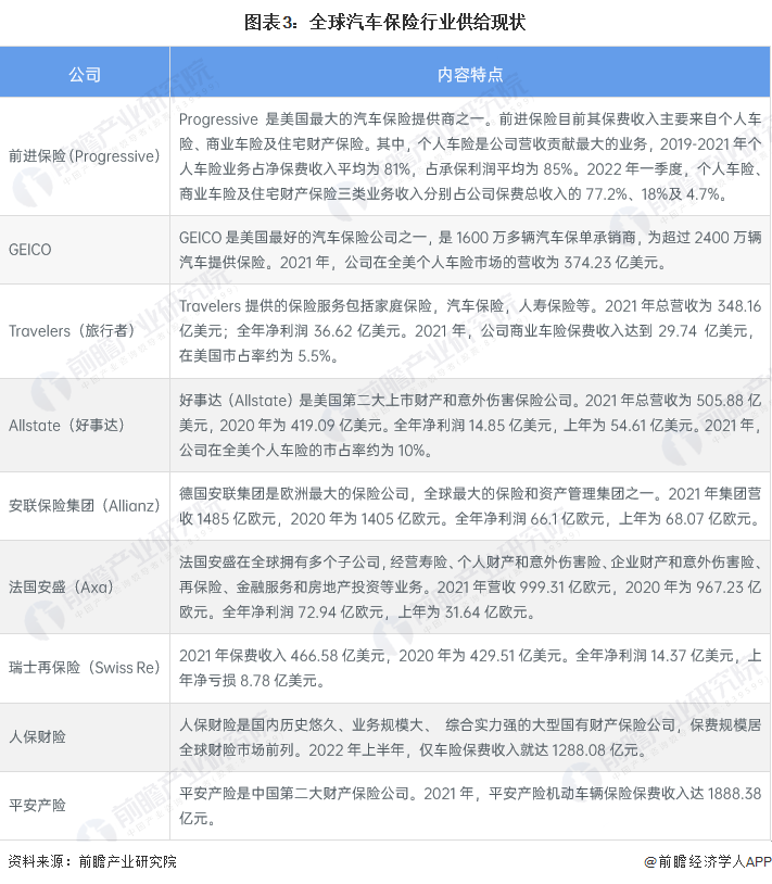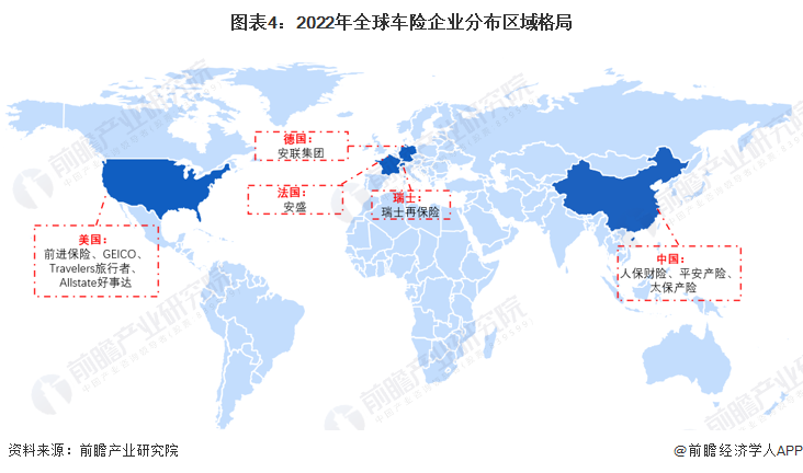 從汽車保險企業分佈來看,中國汽車保險企業主要有「老三家」人保財險、平安產險和太保產險;美國汽車保險企業也較多,主要有前進保險、GETCO、旅行者、好事達等;德國車險企業有安聯保險集團,法國車險企業有安盛集團,瑞士則有瑞士再保險公司。