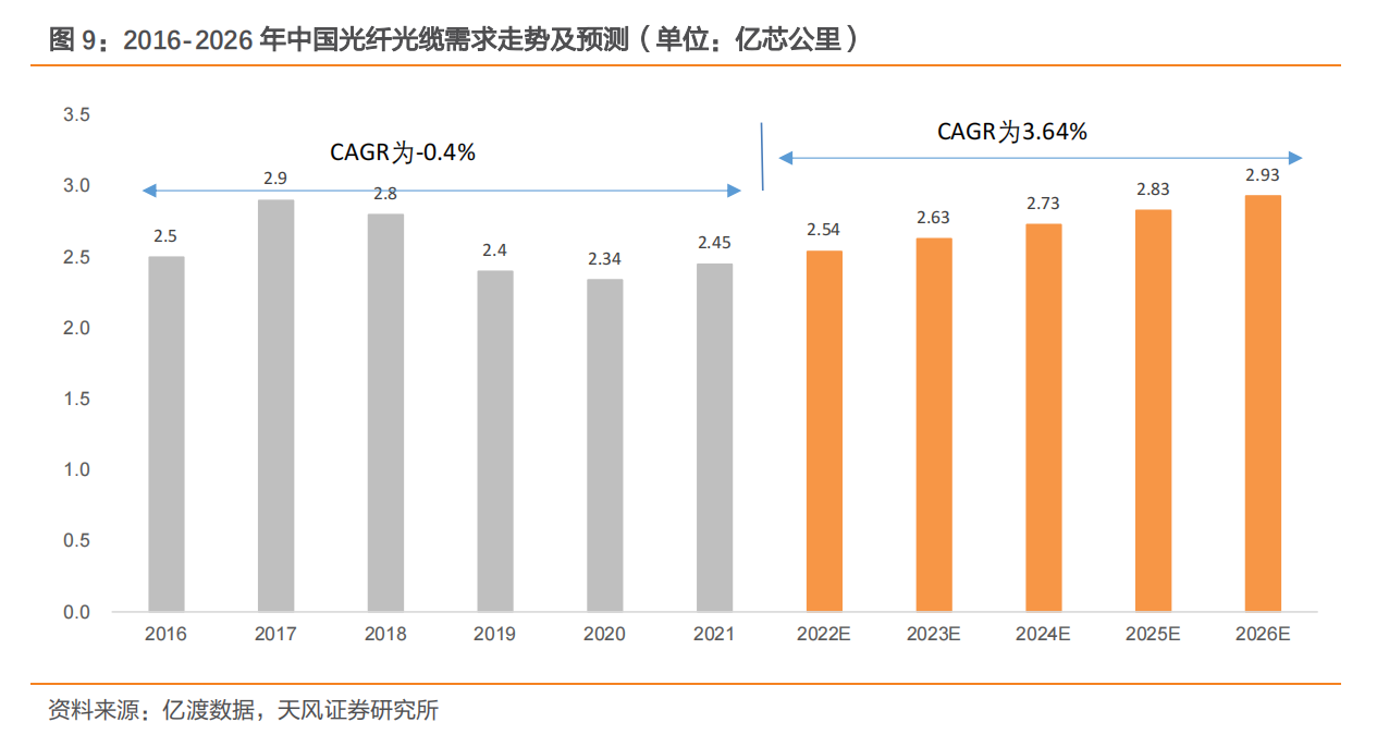 2021年到2022年中國三大運營商的光纜採集回暖,量價回升釋放積極信號,2021年需求回升至2.45億芯公里,同時后期光纖光纜改造升級以及5G和數據中心應用逐步落地,將為光纖光纜行業需求形成有效支撐,據億渡數據預測,2022-2026年中國光纖光纜需求的CAGR為3.64%,2026年有望提升至2.93億芯公里。