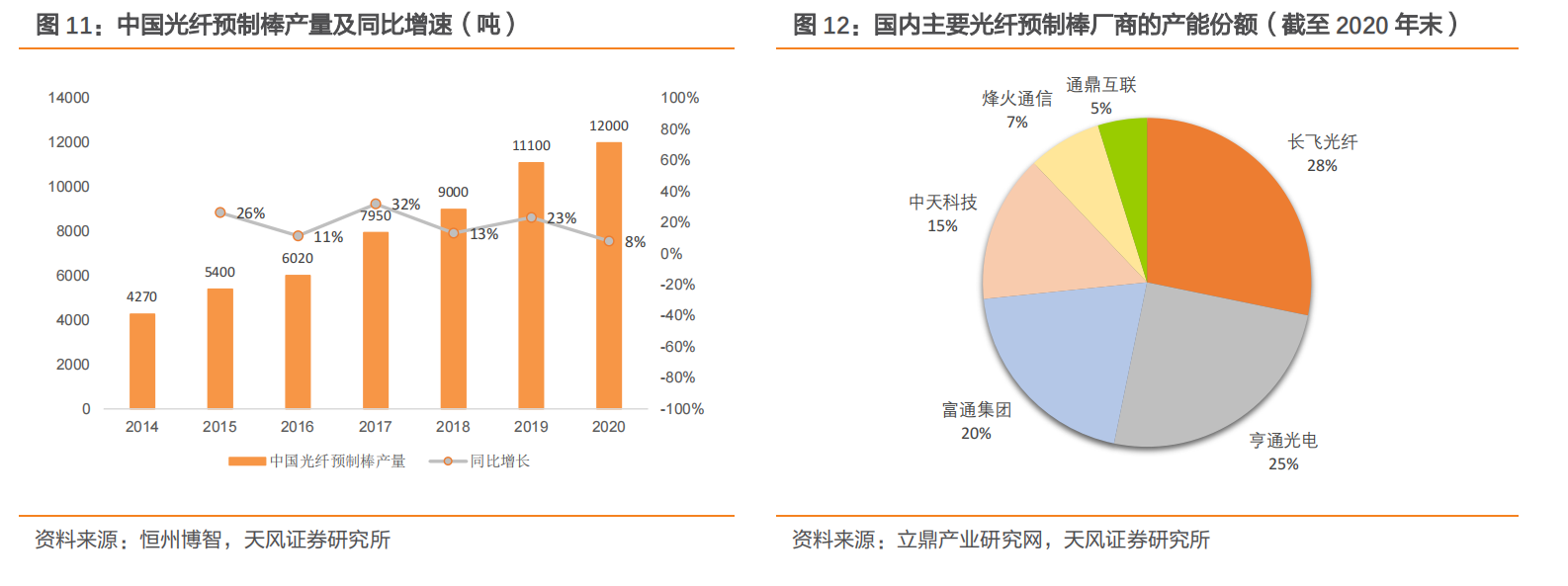 由於光纖、光纜進入壁壘相對較低,行業的產能瓶頸並不在此,行業產能主要取決於上游光纖預製棒的情況。恆州博智的數據顯示,2020年我國光纖預製棒產量達到了1.2萬噸,相比2016年產能擴張一倍,而這些產能主要集中在頭部的長飛光纖、亨通光電、富通集團、中天科技、烽火通信身上,供給相對穩定。