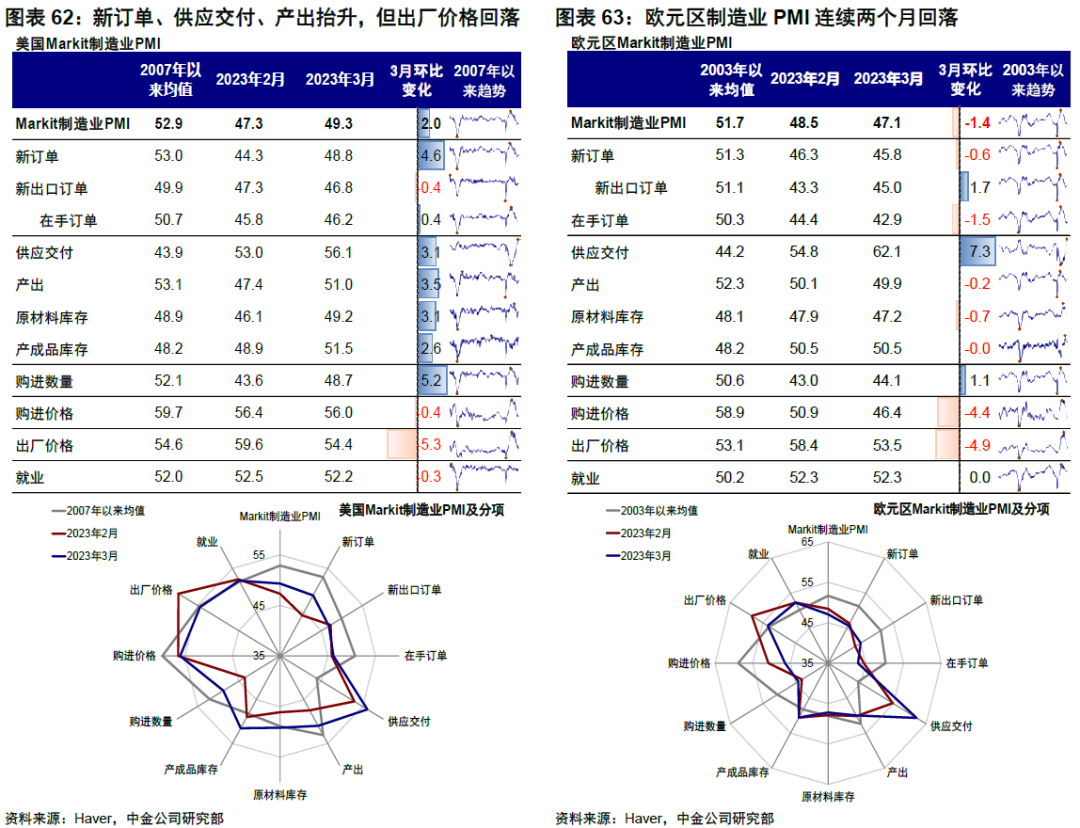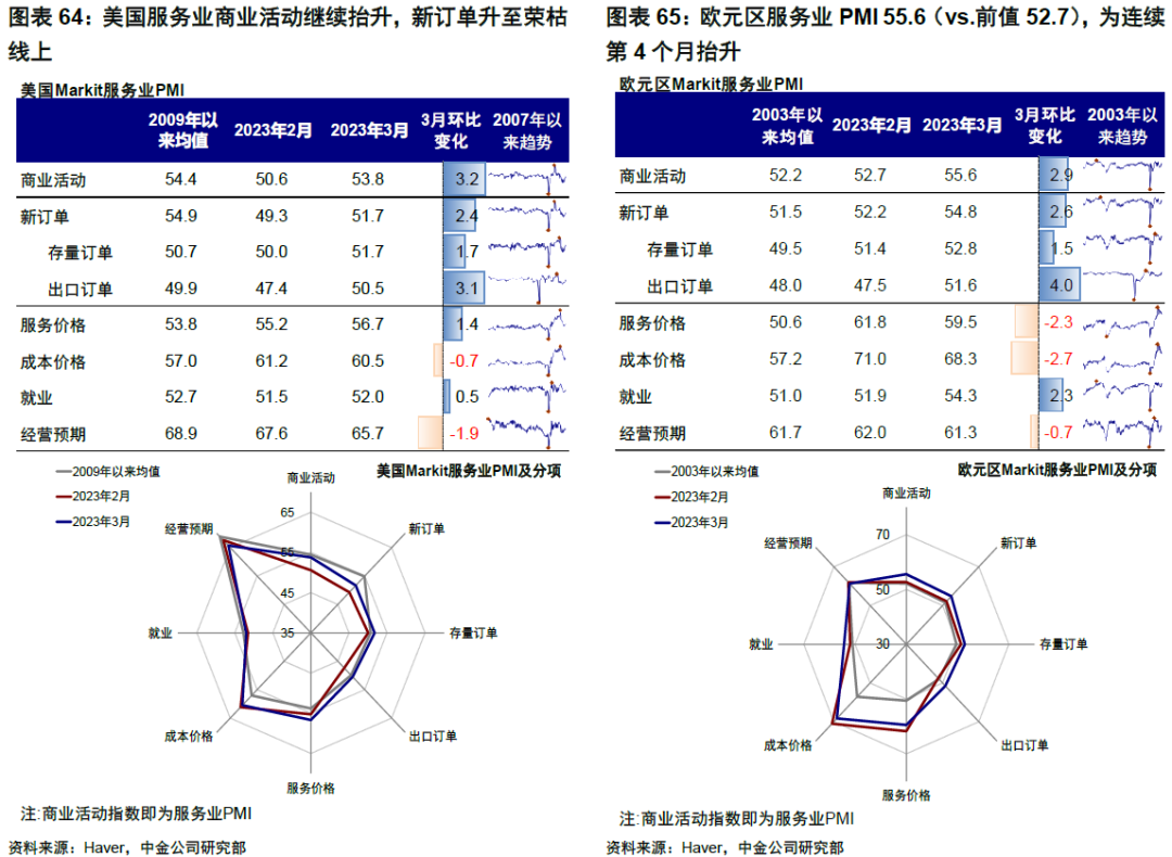 ►基本面與政策:歐美服務業保持強勁。美國:製造業和服務業PMI連續三個月抬升。美國3月Markit製造業PMI 49.3(vs.前值47.3);服務業PMI 53.8(vs.前值50.6)。分項來看,製造業中新訂單、供應交付、產出抬升,但出廠價格回落明顯。服務業分項中,商業活動繼續抬升,新訂單抬升至榮枯線以上。3月數據的確反映出增長尤其是服務業出現的較強韌性,但另一方面,近期發生的銀行系統問題通過信用收縮帶來對增長和通脹的影響可能還需要時間逐步顯現。