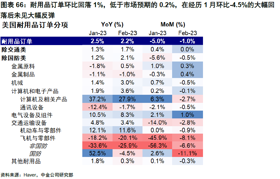 美國:2月耐用品訂單環比下降1%。耐用品訂單環比回落1%,低於市場預期的0.2%,在經歷1月環比-4.5%的大幅回落后未見大幅反彈。飛機與零部件為本月數據的最大拖累,整體環比回落8.1%,剔除交通類的耐用品訂單環比持平,低於修正后前值0.4%;其余訂單也普遍走弱,計算機及相關產品、機械、機動車與零部件等均環比回落。美聯儲的加息對企業投資的抑制已有所體現,在經濟不確定性和企業利潤增長放緩的背景下,這一情況或持續走弱。