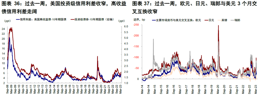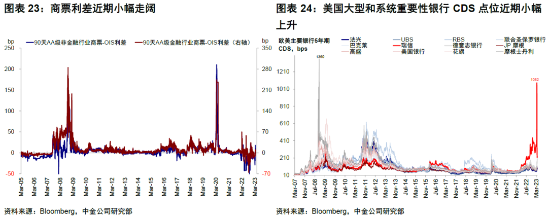 但在當前情緒敏感的情況下,需要關注銀行信用收縮和市場主動尋找風險點而導致風險發生的可能性。美國銀行間流動性充裕程度、貸款違約率(如住房抵押、商業地產抵押和消費貸款等)、以及信貸投放意願下行導致金融條件收緊對企業融資的壓力都是需要后續繼續關注的指標。從高頻數據層面,FRA-OIS利差(衡量銀行間流動性壓力)、CMBS期權調整利差(衡量違約風險)、信用利差和商票利差(衡量融資成本和信用風險)、大型和系統重要性銀行CDS水平當前值與2008年次貸危機時期都有較大距離,包括當前投資者較為擔心的美國商業地產情況,其OAS利差距離2008年也有相當距離。