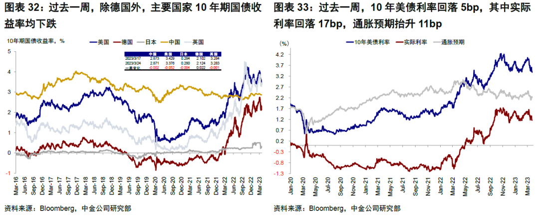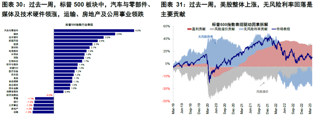 ► 資產表現:股>債>大宗;美股反彈,成長領先。歐美銀行業風險仍存,周初瑞信AT1減記事件引發投資者擔憂,導致債券市場普遍下跌,美債利率走高至3.6%。3月FOMC美聯儲如期加息25bp,但同時暗示加息可能逐步接近尾聲,對於近期銀行風險事件,財政部長耶倫當日卻表示「不考慮大幅提高存款保險額度」[3],受此影響美股整體下挫、銀行板塊領跌。臨近周末,歐洲銀行業擔憂再現,德銀單日跌幅超10%,德法股市再度下探;強勁的服務業和製造業PMI數據提振美股市場情緒,美債利率盤中一度回落至3.3%,美股反彈,成長風格領先。