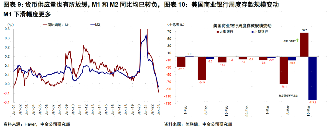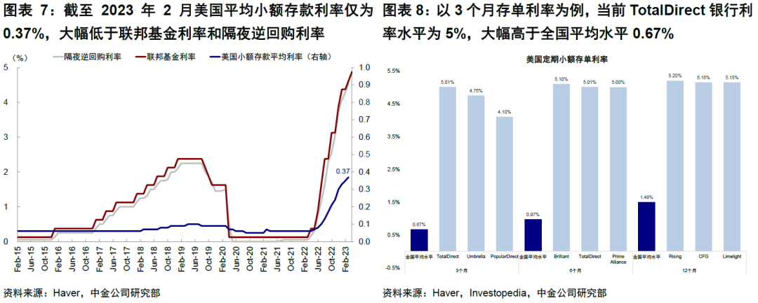 從負債端看,存款自2022高點流出3%,存款利率低是主因;前期以大銀行流失為主,近期中小銀行的流出壓力加大。截至2月底,美國商業銀行存款規模降至1.64萬億美元,較2022年3月高點減少4857億美元,佔其存款總量的3%。但內部分化明顯,前期存款流失反而以大型銀行為主(5371億美元),小銀行卻仍有流入(1400億美元)。究其原因,加息周期中,商業銀行存款利率上行落后於基準利率上行趨勢。截至2023年2月美國平均小額存款利率僅為0.37%,大幅低於聯邦基金利率和隔夜逆回購利率(4.54%)。這一倒掛導致儲户將存款轉移至:1)利率更高的貨幣基金。同期美國貨幣基金規模上升2870億美元至近5萬億美元;2)存單利率更高的小型或網絡銀行。以3個月存單為例,TotalDirect銀行利率為5%,大幅高於全國平均水平0.67%。這一點從宏觀數據上也能得到體現,M1(現金+活期等高流動性存款)和M2(M1+定期存款和部分貨幣基金等)同比均已轉負,但M1下滑幅度更多(2023年1月M1同比增速回落至-4.55%,M2同比增速-1.73%)。