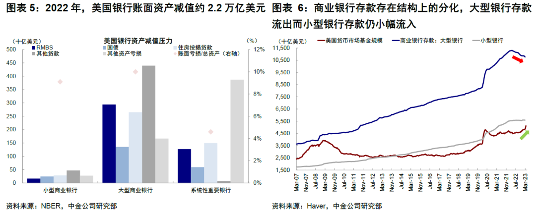 二、整體壓力有多大?哪里是薄弱環節?2022年美聯儲壓力測試結果顯示美國33家大銀行CET1比例最多降至9.7%(監管要求4.5%)。根據NBER測算,即便考慮浮虧,也僅有兩家銀行資產無法償付存款。不過結構分化較為明顯,中小銀行可能是薄弱環節。一方面中小銀行資產充足率整體不及大銀行,另一方面中小銀行業務結構中風險更高業務佔比更多,如商業地產貸款和CMBS證券。此外,存款流失尤其是擠兑風險放大壓力的非線性變化。