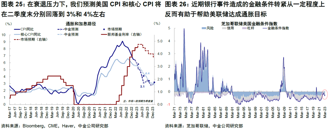 往后看,我們依然認為衰退發生是大概率的判斷,同時堅持在衰退壓力下,美國CPI和核心CPI將在二季度末分別回落到3%和4%左右的預測。近期銀行事件造成的金融條件轉緊和信用收縮從一定程度上反而有助於幫助美聯儲達成通脹目標(此前美聯儲持續加息,但金融條件反而轉松,2月FOMC會議紀要中也顯示出美聯儲對金融條件的關注)。因此,我們認為下半年逐步開啟降息的大門依然存在。