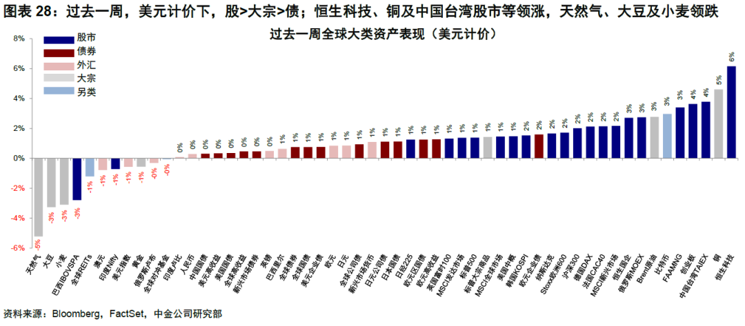 ►資金流向:股票型基金轉為流入,貨幣基金加速流入。過去一周,債券型基金流出放緩,股票型基金轉為流入,貨幣市場基金加速流入。分市場看,新興市場和日本轉為流入,美國轉為流出,歐洲流出放緩,中國流入加速。