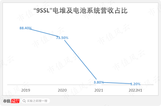 2019-2020年,「9SSL」電堆及相關電池系統的營收佔比,分別高達88%和74%,自2021年起大幅跌至個位數。