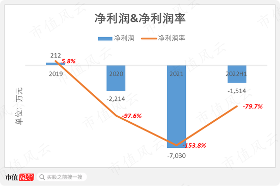 公司的淨利潤自2020年起由正轉負。2021年,公司淨利潤-7,030萬元,對應淨利潤率-154%。