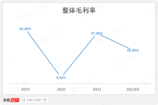 2022年上半年,公司整體毛利率為19%,低於2019年的30%。