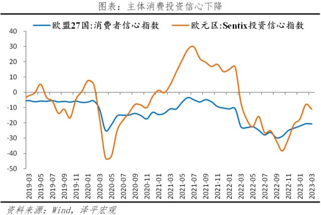 歐美金融震盪加劇金融環境收縮,企業和消費者信心降低,拖累實體經濟。當銀行業出現問題時,銀行會自發收緊其風險敞口,從而導致金融條件收緊。即銀行為保障流動性,縮減信貸發放,企業融資成本提高,引發投資、消費下降,進而導致實體經濟衰退。從主體信心看,3月歐盟27國消費者信心指數為-20.7、歐元區Sentix投資信心指數為-11.1,分別較2月下降0.1和3.1。從經濟景氣度看,3月歐洲製造業PMI和德國PMI持續跌破榮枯線,且較2月分別下降1.4和1.9。