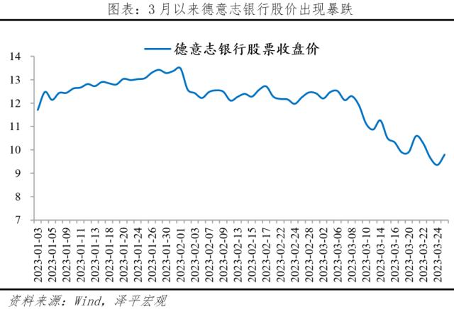 二是黑石危機、瑞信暴雷等事件發酵,引發市場對德銀相關業務的擔憂。經英國金融時報測算,德銀對美國CRE的投資組合達168億歐元,較2020年增加17億歐元。隨着美國商業地產市場景氣度下滑、商業地產基金集中違約,市場擔憂歐美商業地產危機波及德意志銀行。同時,受瑞信事件中AT1債券被完全減記影響,德意志銀行發行的AT1債券價格從月初的95美分跌至24日的70美分。且此前暴雷的瑞士信貸與德銀業務交往緊密,瑞信被收購后資產是否能得到合理處置也為德銀的業績表現帶來一定的不確定性。