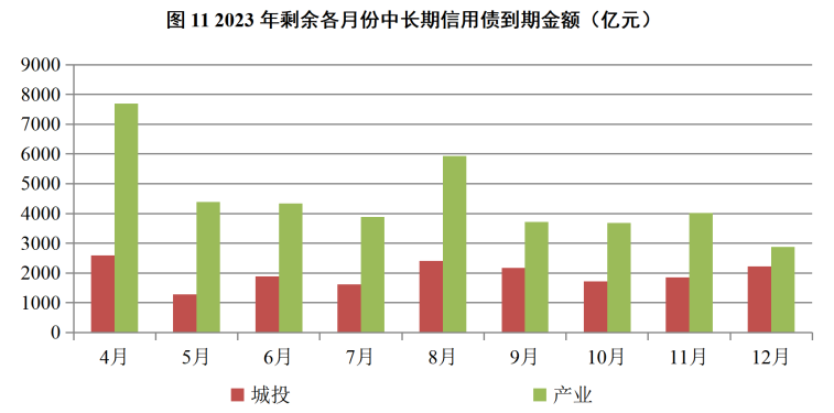 從債券到期規模來看,2023年二季度中長期信用債到期規模2.22萬億元,含回售、提前贖回、提前兑付本金等條款的債券規模約9,200億元,二季度為年內償債高峰,存在一定到期兑付壓力,其中4月份單月到期規模超過1萬億元。從到期債券的企業性質分佈看,國有企業到期規模仍佔據絕對主導,二季度共計1.90萬億元,民營企業到期規模小幅上行至3,003億元。雖然去年以來,監管密集出臺政策,支持民營企業拓寬融資渠道,但從債券市場角度,市場投資風險偏好仍較低,資源向高等級頭部民企集中的趨勢仍較為明顯,需警惕高風險行業尾部、自身造血能力差、短期債務周轉壓力較大的民企信用風險。