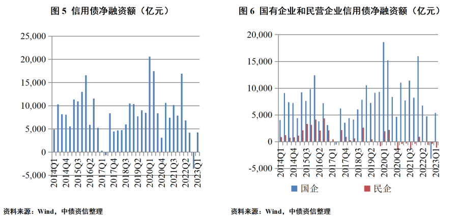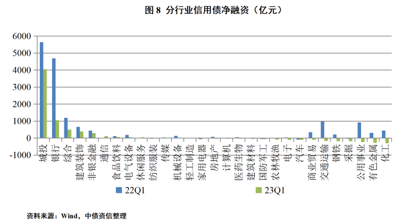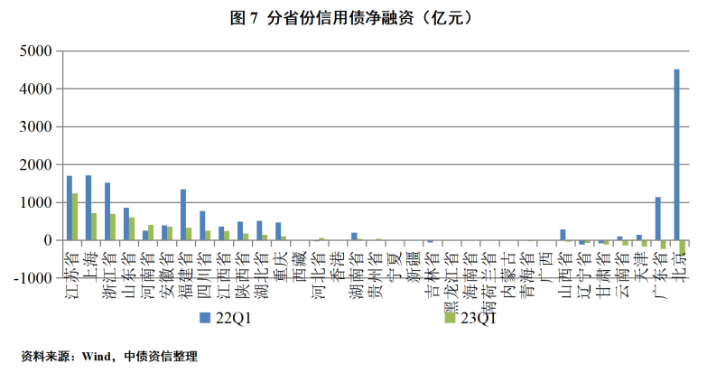 債券市場端,今年以來債券市場逐漸從理財贖回風波中修復,債券信用利差整體看有所下行。期間,部分政策及風險事件的發生對債券市場形成小幅擾動,但整體影響較為有限。一是《商業銀行資本管理辦法》發佈徵求意見稿,其中調整了地方債、次級債、公司類債券等債券的信用風險計量權重,將對相關債券品類的配置需求及相對定價產生一定影響,尤其對同業存單、二級資本債等品類形成一定利空;二是個別次級債出現不贖回事件,引發市場對次級債的擔憂情緒,同時,瑞信銀行AT1全額減記事件也引起市場對國內永續債等相關品類減記風險的關注,二永債市場在一波三折中慢慢修復。一季度,信用債發行總量3.68萬億元,淨融資額為4,271.73億元,淨融資規模環比轉正,但同比仍大幅下降。從企業結構來看,一季度債券市場融資仍以國有企業佔據絕對主導,淨融資規模環比轉正為5,392.20億元,民營企業信用債淨融資額為-1,111.97億元,環比和同比均弱化;從分省份淨融資規模來看,江蘇、浙江等東部地區持續淨流入,但相較去年同期規模顯著回落,北京、廣東省等淨融資額同比下滑明顯,河南省、河北省、貴州省等則相較去年同期淨融資規模有所回升,而廣西、遼寧、甘肅等淨融資規模均為負值,區域分化依然顯著;從行業結構來看,城投、銀行、綜合、建築裝飾、非銀金融等行業淨融資規模靠前,化工、有色、公用事業、採掘等淨融資額排名靠后。其中房地產行業信用債淨融資為-30.40億元,環比和同比均小幅弱化。